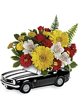 Vroom vroom! Get Father's Day rolling with this cheerful yellow and red bouquet, arranged in the coolest black vintage Camaro. He's sure to get a kick out of the fun-filled ceramic keepsake!. This colorful arrangement includes miniature yellow gerberas, white alstroemeria, red miniature carnations, red matsumoto asters, yellow button spray chrysanthemums, variegated pittosporum and sword fern. Delivered in Teleflora's '67 Chevy Camaro keepsake. This colorful arrangement includes red spray roses, miniature yellow gerberas, white alstroemeria, red miniature carnations, red matsumoto asters, yellow button spray chrysanthemums, variegated pittosporum and sword fern. Delivered in Teleflora's '67 Chevy Camaro keepsake. This colorful arrangement includes red spray roses, miniature yellow gerberas, white alstroemeria, red miniature carnations, red matsumoto asters, yellow button spray chrysanthemums, variegated pittosporum and sword fern. Delivered in Teleflora's '67 Chevy Camaro keepsake. Orientation: All-Around. Teleflora P_T19F100A – '67 Chevy Camaro Bouquet – Red – Flower Delivery, Premium Arrangement
