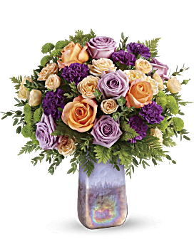 As glorious as a sunrise, this magnificent medley of lavender and peach roses is a beautiful gift for any occasion! It's made extra special thanks to its hand-blown art glass vase with shimmering iridescent finish, a breathtaking gift they'll love forever. This glorious bouquet includes lavender roses, peach roses, peach spray roses, purple carnations, green button spray chrysanthemums, leatherleaf fern, and parvifolia eucalyptus. Delivered in Teleflora's Amethyst Gemstone Art Glass vase. This glorious bouquet includes lavender roses, peach roses, peach spray roses, purple carnations, green button spray chrysanthemums, leatherleaf fern, and parvifolia eucalyptus. Delivered in Teleflora's Amethyst Gemstone Art Glass vase. This glorious bouquet includes lavender roses, peach roses, peach spray roses, purple carnations, green button spray chrysanthemums, leatherleaf fern, and parvifolia eucalyptus. Delivered in Teleflora's Amethyst Gemstone Art Glass vase. Orientation: All-Around. Teleflora P_Tev58-2A – Amethyst Sunrise Bouquet – Peach – Flower Delivery, Deluxe Arrangement