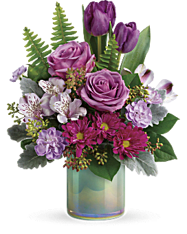 The shimmering, iridescent aqua blue glass of this stunning cylinder vase is the perfect partner for a fresh, fabulous bouquet of lavender roses, alstroemeria and tulips!. This artistic arrangement features lavender roses, purple tulips, lavender alstroemeria, lavender miniature carnations, purple daisy spray chrysanthemums, dusty miller, seeded eucalyptus, sword fern, and lemon leaf. Delivered in Teleflora's Art Glass Garden Cylinder. This artistic arrangement features lavender roses, purple tulips, lavender alstroemeria, lavender miniature carnations, purple daisy spray chrysanthemums, dusty miller, seeded eucalyptus, sword fern, and lemon leaf. Delivered in Teleflora's Art Glass Garden Cylinder. This artistic arrangement features lavender roses, purple tulips, lavender alstroemeria, lavender miniature carnations, purple daisy spray chrysanthemums, dusty miller, seeded eucalyptus, sword fern, and lemon leaf. Delivered in Teleflora's Art Glass Garden Cylinder. Orientation: All-Around. Teleflora P_T19E300A – Art Glass Garden Bouquet – Blue – Flower Delivery, Deluxe Arrangement