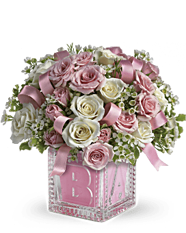 She'll be building block castles soon enough! For now, celebrate her life with this beautiful keepsake baby block. Filled with soft pinks and whites, the glass block can be used later in baby's room and makes a memorable baby girl present. A light pink ribbon weaves through white and pink spray roses in a keepsake glass Baby Block vase. A light pink ribbon weaves through white and pink spray roses in a keepsake glass Baby Block vase. A light pink ribbon weaves through white and pink roses in a keepsake glass Baby Block vase. Orientation: All-Around. Teleflora P_T37-2A – Baby's First Block – Pink – Flower Delivery, Standard Arrangement