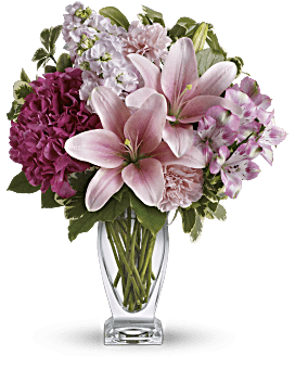 Make her blush with this romantic mix of fragrant lilies and lush hydrangea in dreamy shades of pink. Presented in our elegant couture glass vase, this beautiful bouquet is affection perfection!. Includes pink hydrangea, asiatic lilies, alstroemeria, carnations and stock, accented with fresh greens. Delivered in Teleflora's Couture vase. Includes pink hydrangea, asiatic lilies, alstroemeria, carnations and stock, accented with fresh greens. Delivered in Teleflora's Couture vase. Includes pink hydrangea, asiatic lilies, alstroemeria, carnations and stock, accented with fresh greens. Delivered in Teleflora's Couture vase. Orientation: All-Around. Teleflora Blush Of Love Bouquet – Multi – Flower Delivery, Premium Arrangement
