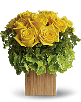 Sunny yellow roses go Zen! This modern rose arrangement features joyful yellow roses and unique green hydrangea in a beautiful bamboo cube vase. It's a stylish choice for anyone, anytime. Lush yellow roses and fresh green hydrangea are mixed with green bupleurum in a natural bamboo cube vase. Lush yellow roses and fresh green hydrangea are mixed with green bupleurum in a natural bamboo cube vase. Lush yellow roses and fresh green hydrangea are mixed with green bupleurum in a natural bamboo cube vase. Orientation: All-Around. Teleflora P_T72-2A – Box Of Sunshine – Yellow – Flower Delivery, Premium Arrangement