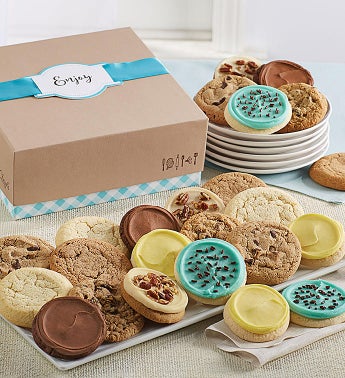 Add your personal touch with a message hangtag and a delicious assortment of Cheryl’s individually wrapped cookies. We’ve included classic flavors like chocolate chip, oatmeal raisin, sugar and snickerdoodle along with buttercream frosted cuts-outs and premier flavors like frosted triple chocolate and lemon burst. 12 cookies. (also available in 24 and 36 cookie boxes)