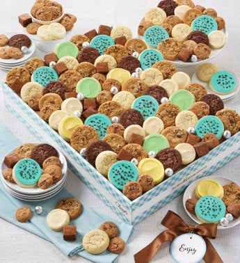 Our customers love this dessert box! It’s perfect for business meetings and events, or when you need to send a gift of food. We’ve included a delicious assortment of Cheryl’s snack size cookies and brownies, assorted buttercream frosted cookies, signature brownies, crunchy chocolate chip cookies and foil wrapped milk chocolates. Choose your message tag. 154 pieces.
