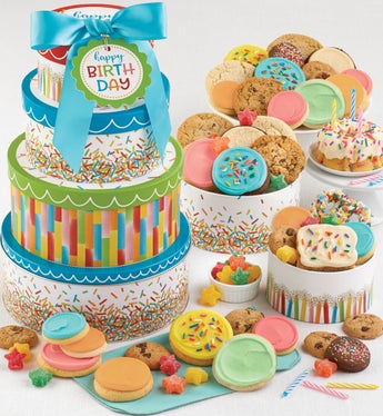 A birthday gift they will never forget! Cheryl’s festive gift tower arrives with heir popular individually wrapped chocolate and vanilla buttercream frosted birthday confetti cake cookies that taste just like birthday cake, assorted snack size cookies, frosted key lime white chocolate cookies, an assortment of gourmet cookies, a delicious confetti mini cake and candles, sour gummy stars and a sprinkled pretzel twist.
