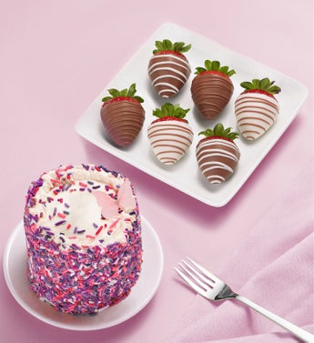 Spring has truly sprung with this delicious set. Surprise a special someone with luscious hand dipped chocolate covered strawberries and a delicious 3 layer cake that is sure to put a smile on their face! To make the cake even sweeter an adorable butterfly is included all tucked away in a pink box. Choose either the 6 count or the 12 count chocolate covered strawberries. The 4″ diameter yellow cake is decorated with creamy vanilla butter cream and covered with pink and purple sprinkles – this cake serves 4. Their smile will shine brighter than a ray of sunshine!
