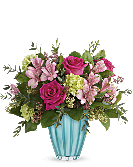 Spring has sprung! Capture the enchantment of the new season with this cheerful rose bouquet, perfectly presented in a gorgeous European glass vase in the most awe-inspiring shade of aqua. This enchanting bouquet includes hot pink roses, pink alstroemeria, green carnations, parvifolia eucalyptus, lemon leaf, and seeded eucalyptus. Delivered in Teleflora's Enchanted Spring vase. This enchanting bouquet includes hot pink roses, pink alstroemeria, green carnations, parvifolia eucalyptus, lemon leaf, and seeded eucalyptus. Delivered in Teleflora's Enchanted Spring vase. This enchanting bouquet includes hot pink roses, pink alstroemeria, green carnations, parvifolia eucalyptus, lemon leaf, and seeded eucalyptus. Delivered in Teleflora's Enchanted Spring vase. Orientation: All-Around. Teleflora P_T21E100A – Enchanted Spring Bouquet – Multi – Flower Delivery, Premium Arrangement