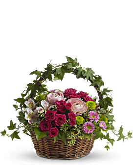 A fairy taleâ¦in flowers! Delicate ivy climbs the handle of this round wicker basket that's home to a feminine garden of fuchsia flowers. You can almost imagine garden sprites dancing through the country style arrangement!. A round wicker basket holds an array of fresh flowers including hot pink roses, pale orange roses, pink ranunculus, pink alstroemeria, light pink matsumoto asters and green button mums. Ivy, seeded eucalyptus and oregonia add lush greenery. A round wicker basket holds an array of fresh flowers including hot pink roses, pale orange roses, pink ranunculus, pink alstroemeria, light pink matsumoto asters and green button mums. Ivy, seeded eucalyptus and oregonia add lush greenery. A round wicker basket holds an array of fresh flowers including hot pink roses, pale orange roses, pink ranunculus, pink alstroemeria, light pink matsumoto asters and green button mums. Ivy, seeded eucalyptus and oregonia add lush greenery. Orientation: All-Around. Teleflora P_T147-3A – Fairest Of All – Fuchsia – Flower Delivery, Deluxe Arrangement