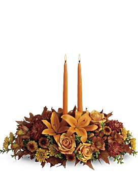 Graciously gather your family around the warm glow and classic autumn colors of this stunning Thanksgiving centerpiece. A lush variety of burnt orange blooms are gathered under a pair of tall, graceful candles – perfect for decorating your Thanksgiving dinner table, entryway or hearth. Fall flowers include orange roses, orange asiatic lilies, dark orange alstroemeria, bronze button mums, yellow cushion mums, rust cushion mums, green oregonia and green huckleberry. Accented with oak leaves and two orange taper candles. Fall flowers include orange roses, orange asiatic lilies, dark orange alstroemeria, bronze button mums, yellow cushion mums, rust cushion mums, green oregonia and green huckleberry. Accented with oak leaves and two orange taper candles. Fall flowers include orange roses, orange asiatic lilies, dark orange alstroemeria, bronze button mums, yellow cushion mums, rust cushion mums, green oregonia and green huckleberry. Accented with oak leaves and two orange taper candles. Orientation: All-Around. Teleflora P_T169-1A – Family Gathering Centerpiece – Orange – Flower Delivery, Deluxe Arrangement