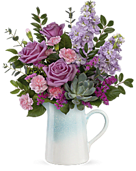 Lavender and pink Motherâs Day flowers fill a blue ombre stoneware pitcher. This bouquet is the perfect gift for Mom. Lavender roses, lavender stock, miniature pink carnations, raspberry sinuata statice and a potted echeveria succulent are arranged with parvifolia eucalyptus and huckleberry. Delivered in Teleflora's Farmhouse Chic Pitcher. Lavender roses, lavender stock, miniature pink carnations, raspberry sinuata statice and a potted echeveria succulent are arranged with parvifolia eucalyptus and huckleberry. Delivered in Teleflora's Farmhouse Chic Pitcher. Lavender roses, lavender stock, miniature pink carnations, raspberry sinuata statice and a potted echeveria succulent are arranged with parvifolia eucalyptus and huckleberry. Delivered in Teleflora's Farmhouse Chic Pitcher. Orientation: All-Around. Teleflora P_T21M200A – Farmhouse Chic Bouquet – Blue – Flower Delivery, Standard Arrangement