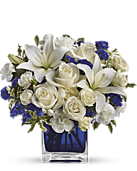 Like gazing into a clear blue sky, this serene arrangement soothes the soul and cheers the heart. Its creamy roses and snowy lilies are arranged in our dazzling sapphire cube. Crème roses, white asiatic lilies and white miniature carnations are mixed with bursts of purple statice and green pitta negra. Delivered in Teleflora's glass Cube. Crème roses, white asiatic lilies and white miniature carnations are mixed with bursts of purple statice and green pitta negra. Delivered in Teleflora's glass Cube. Crème roses, white asiatic lilies and white miniature carnations are mixed with bursts of purple statice and green pitta negra. Delivered in Teleflora's glass Cube. Orientation: All-Around. Teleflora P_Tev25-3A – Sapphire Skies Bouquet – Blue – Flower Delivery, Deluxe Arrangement
