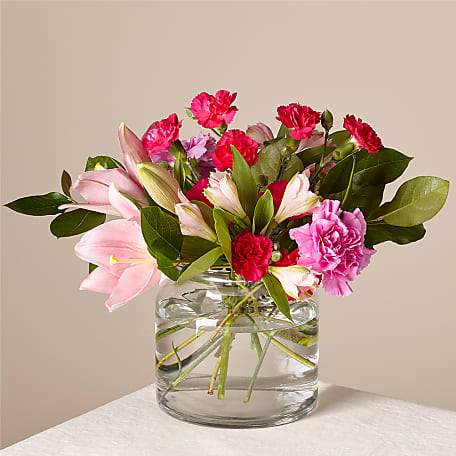 Blossoms in pink and coral hues are contrasted with fresh foliage to make anyone's heart flutter. This bouquet features a sweet assortment of timeless florals like spray roses, lilies and alstroemeria to share just how much you care. Please Note: The bouquet pictured reflects our original design for this product. While we always try to follow the color palette, we may replace stems to deliver the freshest bouquet possible, and we may sometimes need to use a different vase.