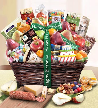 Make it a truly memorable birthday with this deluxe basket filled with premium quality gourmet foods, fruits, and sweets. This handsome walnut stained wicker basket has wood handles and is filled with six types of fresh fruit, nuts, Italian salame, cheese, snacks, chocolate and other candies. This gift really shows how much you care!