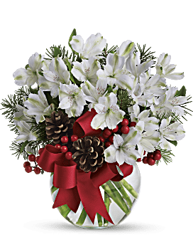 Fresh as new fallen snow. Delicate, snow white flowers are decorated with berries and pinecones for a unique spin on tradition. Presented in a crystal clear bowl tied with red ribbon, this Christmas floral arrangement is exceptionally value priced. White alstroemeria and Douglas fir are mixed with pinecones and red berries in a clear bowl decorated with red satin ribbon. White alstroemeria and Douglas fir are mixed with pinecones and red berries in a clear bowl decorated with red satin ribbon. White alstroemeria and Douglas fir are mixed with pinecones and red berries in a clear bowl decorated with red satin ribbon. Orientation: All-Around. Teleflora P_T128-1A – Let It Snow – Red – Flower Delivery, Premium Arrangement