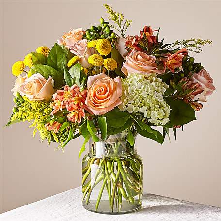 This radiant bouquet is designed with a dreamy mix of peach, yellow, and light green blooms to create the perfect impression. Whether it's sent as a pick–me–up, a celebration, or just to make someone smile, everything is just peachy once this arrangement arrives. Please Note: The bouquet pictured reflects our original design for this product. While we always try to follow the color palette, we may replace stems to deliver the freshest bouquet possible, and we may sometimes need to use a different vase.
