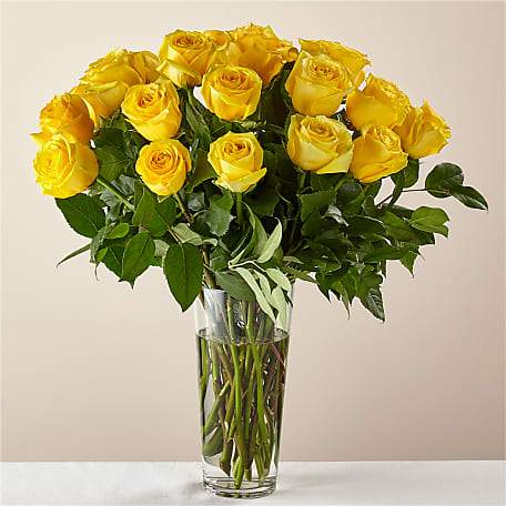 Nothing brightens someone's day quite like the sunny shade of yellow. While vibrant yellow roses are a symbol of friendship, this bouquet makes a welcomed gift for any loved one. Please Note: The bouquet pictured reflects our original design for this product. While we always try to follow the color palette, we may replace stems to deliver the freshest bouquet possible, and we may sometimes need to use a different vase.