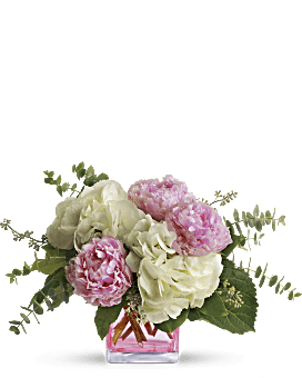 Good and girly! A fabulous pick for a stylish sister, friend or girlfriend, this trendy peony bouquet pairs lush, cloud-white hydrangea with the luscious beauty of pink peonies. The modern feminine arrangement is presented in a fun pink glass cube vase she's sure to use again and again. White hydrangea and pink peonies are accented with spiral and seeded eucalyptus in a pink glass cube vase. White hydrangea and pink peonies are accented with spiral and seeded eucalyptus in a pink glass cube vase. White hydrangea and pink peonies are accented with spiral and seeded eucalyptus in a pink glass cube vase. Orientation: All-Around. Teleflora Pretty In Peony – Pink – Flower Delivery, Premium Arrangement