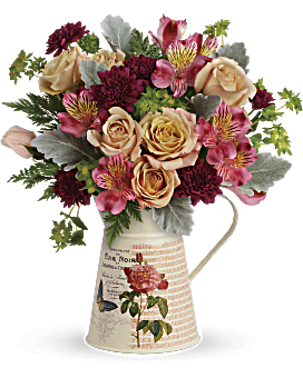 As timeless as mom's love, this beautiful bouquet of peach roses and burgundy mums has a vintage feel that's right at home in this hand-glazed metal watering pitcher!. This beautiful bouquet of peach spray roses, pink alstroemeria, and burgundy cushion spray chrysanthemums is accented with bupleurum, dusty miller, and leatherleaf fern. Delivered in Teleflora's Mod Mademoiselle pitcher. This beautiful bouquet of white roses, peach spray roses, pink alstroemeria, and burgundy cushion spray chrysanthemums is accented with bupleurum, dusty miller, and leatherleaf fern. Delivered in Teleflora's Mod Mademoiselle pitcher. This beautiful bouquet of white roses, peach spray roses, pink alstroemeria, and burgundy cushion spray chrysanthemums is accented with bupleurum, dusty miller, and leatherleaf fern. Delivered in Teleflora's Mod Mademoiselle pitcher. Orientation: All-Around. Teleflora P_T19M300A – Mod Mademoiselle Bouquet – Peach – Flower Delivery, Premium Arrangement