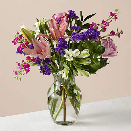 Full of seasonal color, rich texture, and sweet fragrance, our Flower Power Bouquet uplifts any moment. This charming arrangement features an abundance of roses, lilies, alstroemeria, and more in a clear glass vase.