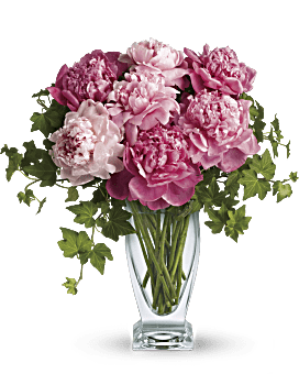 Peony perfection! Everyone loves the lush, cloud-like appearance of fresh cut peonies. The romantic, feminine bloom is a popular summer wedding flower. In fact, many brides select their June or July wedding dates based on the cut peony flower season! This simple bouquet is a beautiful pick for any pink-lover. Also, a luxurious wedding centerpiece!. Freshly cut pink peonies and classic green ivy are gathered elegantly into Teleflora's Couture glass vase. Freshly cut pink peonies and classic green ivy are gathered elegantly into Teleflora's Couture glass vase. Freshly cut pink peonies and classic green ivy are gathered elegantly into Teleflora's Couture glass vase. Orientation: All-Around. Teleflora Perfect Peonies – Multi – Flower Delivery, Standard Arrangement