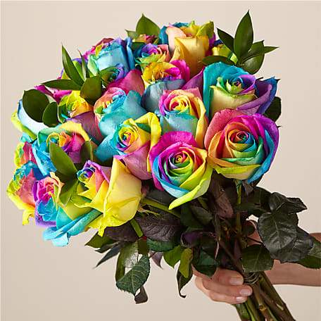 There is no more magical, natural occurrence than a rainbow – have it be in the sky or in a fresh floral arrangement. Our bouquet of two dozen hand-dyed roses symbolizes the majestic phenomenon, with its brilliant colors in each bloom.