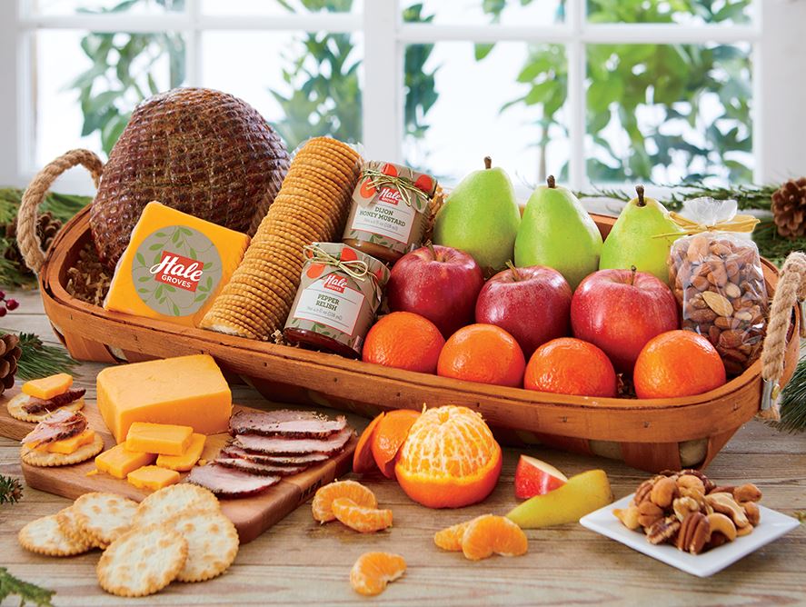 Savory Selects Gift Basket: Fresh fruit with savory treats is a great combination Our grove-fresh fruit tastes even better when paired with this selection of savory foods from some of our favorite artisans. Sweet Tangerines, crisp Orchard Apples and creamy D’Anjou pears are beautifully presented in a rustic woven basket with rope handles. Inside is everything you need for a holiday feast: Peppered Ham, Mixed Nuts, Water Crackers, Cheddar Cheese, Honey Dijon Mustard and Pepper Relish. Just the right size for families. -Fruit gift with savory foods -Great for those hard-to-buy-for people -Ham, cheese, crackers and nuts make this substantial -Variety gift basket Contents -1 2-3 lb. Peppered Ham -4 Tangerines -3 D’Anjou Pears -3 Orchard Apples -5 oz. Mixed Nuts -8 oz. Vintage Cheddar Cheese -1 box Water Crackers -5 oz. Honey Dijon Mustard -5 oz. Pepper Relish -1 23" x 10" x 3" Basket