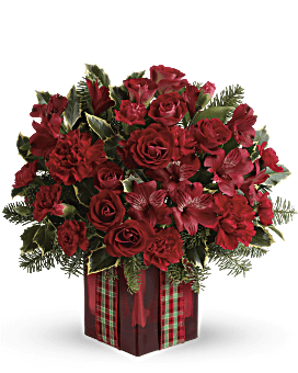'Tis the season for fabulous surprises! Send one they'll never forget with this luxurious crimson bouquet arranged in our eye-catching red mirrored glass cube, and finished with holiday plaid ribbon. A radiant red gift, this holiday arrangement features red spray roses, red alstroemeria, standard and miniature red carnations, variegated holly, noble fir and festive plaid ribbon. Delivered in Teleflora's exclusive red Mirrored Cube vase. A radiant red gift, this holiday arrangement features red spray roses, red alstroemeria, standard and miniature red carnations, variegated holly, noble fir and festive plaid ribbon. Delivered in Teleflora's exclusive red Mirrored Cube vase. A radiant red gift, this holiday arrangement features red spray roses, red alstroemeria, standard and miniature red carnations, variegated holly, noble fir and festive plaid ribbon. Delivered in Teleflora's exclusive red Mirrored Cube vase. Orientation: All-Around. Teleflora P_Twr11-1A – Season's Surprise Bouquet – Red – Flower Delivery, Premium Arrangement