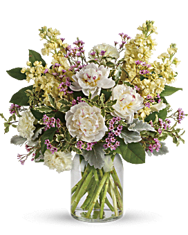 Chic and serene, this dreamy bouquet of wondrous white peonies and creamy blooms in a milk jug vase sends your very best wishes for a stylish spring!. This serene arrangement features white peonies, light yellow carnations, light yellow stock, lavender waxflower, dusty miller, pitta negra, and lemon leaf. Delivered in a clear glass milk jug vase. This serene arrangement features white peonies, light yellow carnations, light yellow stock, lavender waxflower, dusty miller, pitta negra, and lemon leaf. Delivered in a clear glass milk jug vase. This serene arrangement features white peonies, light yellow carnations, light yellow stock, lavender waxflower, dusty miller, pitta negra, and lemon leaf. Delivered in a clear glass milk jug vase. Orientation: All-Around. Teleflora P_Tsp06-1A – Serene Spring Peony Bouquet – White – Flower Delivery, Deluxe Arrangement