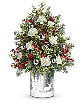 Deck the halls with this elegant Christmas tree-inspired arrangement, festively presented in a glass cylinder with sparkling silver finish and serene, snowy wonderland scene. This arrangement includes miniature white carnations, oregonia, and noble fir. Delivered in Teleflora's Wintry Wishes Cylinder. This arrangement includes miniature white carnations, oregonia, and noble fir. Delivered in Teleflora's Wintry Wishes Cylinder. This arrangement includes miniature white carnations, oregonia, and noble fir. Delivered in Teleflora's Wintry Wishes Cylinder. Orientation: All-Around. Teleflora P_T20X610A – Snowy Wonderland Tree – Silver – Flower Delivery, Deluxe Arrangement