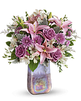 This luxurious Motherâs Day bouquet is made up of roses and lilies and fills a hand-blown glass vase for Mom. This arrangement for Mom includes lavender roses, pink asiatic lilies, light pink alstroemeria, lavender cushion spray chrysanthemums, lavender limonium, dusty miller, parvifolia eucalyptus, and lemon leaf.Delivered in Teleflora's Gemstone Art Glass Vase. This arrangement for Mom includes lavender roses, pink asiatic lilies, light pink alstroemeria, lavender cushion spray chrysanthemums, lavender limonium, dusty miller, parvifolia eucalyptus, and lemon leaf.Delivered in Teleflora's Gemstone Art Glass Vase. This arrangement for Mom includes lavender roses, pink asiatic lilies, light pink alstroemeria, lavender cushion spray chrysanthemums, lavender limonium, dusty miller, parvifolia eucalyptus, and lemon leaf.Delivered in Teleflora's Gemstone Art Glass Vase. Orientation: All-Around. Teleflora P_T21M500A – Stunning Swirls Bouquet – Multi – Flower Delivery, Standard Arrangement