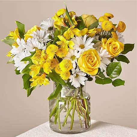 Share some sunshine with your loved ones with this cheery bouquet. Designed with uplifting shades of yellow, this bouquet features classic blooms to boost their mood & make any day brighter. Please Note: The bouquet pictured reflects our original design for this product. While we always try to follow the color palette, we may replace stems to deliver the freshest bouquet possible, and we may sometimes need to use a different vase.