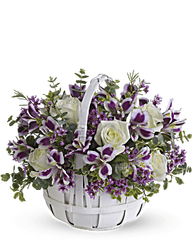 As sweet as a walk down a country lane, this gift basket of white roses and purple alstroemeria is a delicate reminder of your affection, any day of the week. A white wicker basket makes a charming presentation of white roses, purple alstroemeria, lavender waxflower, spiral eucalyptus and pitta negra. A white wicker basket makes a charming presentation of white roses, purple alstroemeria, lavender waxflower, spiral eucalyptus and pitta negra. A white wicker basket makes a charming presentation of white roses, purple alstroemeria, lavender waxflower, spiral eucalyptus and pitta negra. Orientation: All-Around. Teleflora P_T68-2A – Sweet Moments – White – Flower Delivery, Premium Arrangement