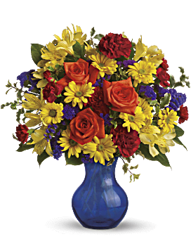 Three cheers for the season's happiest flowers in a rich cobalt blue vase! Beautifully arranged and beautifully priced, this delightful bouquet makes a brilliant birthday gift. It's also a great way to say "I'm thinking of you.". The bright bouquet includes orange roses, yellow alstroemeria, red carnations and miniature carnations, yellow daisy spray chrysanthemums and purple statice accented with assorted greenery.Delivered in a cobalt blue Serendipity vase. The cheerful bouquet includes orange roses, yellow alstroemeria, red carnations and miniature carnations, yellow daisy spray chrysanthemums and purple statice accented with assorted greenery. Delivered in a cobalt blue Serendipity vase. The cheerful bouquet includes orange roses, yellow alstroemeria, red carnations and miniature carnations, yellow daisy spray chrysanthemums and purple statice accented with assorted greenery. Delivered in a cobalt blue Serendipity vase. Orientation: All-Around. Teleflora P_Tev01-1A – Three Cheers For You! – Blue – Flower Delivery, Premium Arrangement