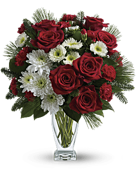 No mistletoe required! Simply send this romantic bouquet of snow whites and rich reds arranged in our sculpted glass vase, and you're guaranteed a spot on her "nice" list. This heartwarming bouquet includes red roses, red carnations, red miniature carnations, white matsumoto asters, white cushion chrysanthemums, noble fir, white pine and lemon leaf. Delivered in Teleflora's exclusive glass Couture vase. This heartwarming bouquet includes red roses, red carnations, red miniature carnations, white matsumoto asters, white cushion chrysanthemums, noble fir, white pine and lemon leaf. Delivered in Teleflora's exclusive glass Couture vase. This heartwarming bouquet includes red roses, red carnations, red miniature carnations, white matsumoto asters, white cushion chrysanthemums, noble fir, white pine and lemon leaf. Delivered in Teleflora's exclusive glass Couture vase. Orientation: All-Around. Teleflora P_Twr12-1A – Winter Kisses Bouquet – Multi – Flower Delivery, Standard Arrangement